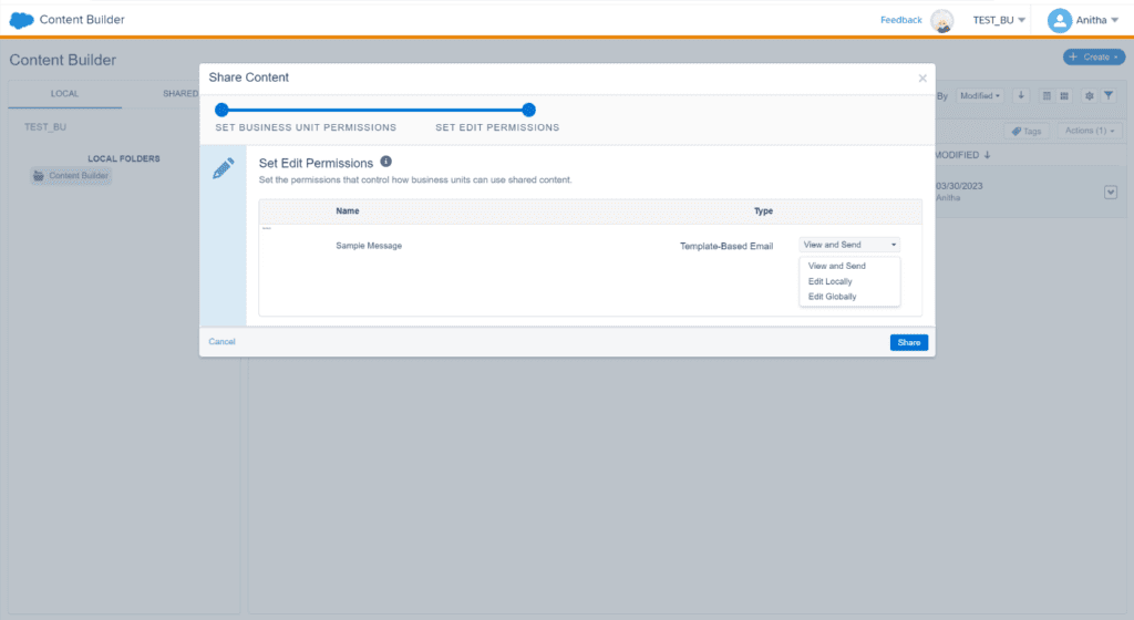 - Content Builder offers different sharing options, including View and Send, Edit Globally, and Edit Locally, allowing recipients to view, edit, or create local edits of shared content.