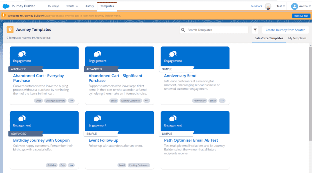 There are pre-made journey templates that either Salesforce or other users create. A new customer journey can be started using these templates, which can then be customised to meet particular needs.
