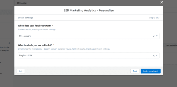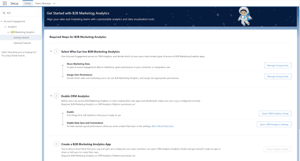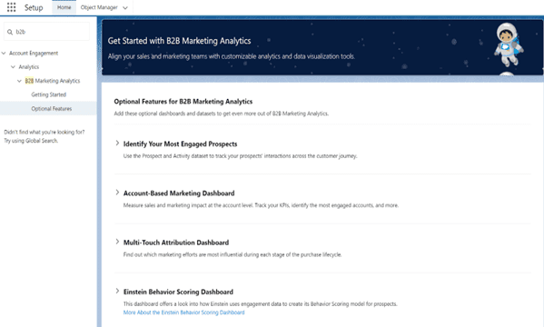 - Go to Marketing Setup > B2B Marketing Analytics > Getting Started