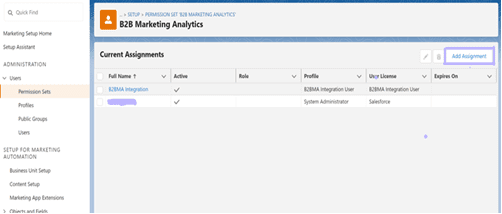 - Share marketing data: Click Manage Assignments, then add the integration user to the selected permission set