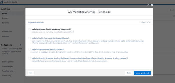 Once you have enabled B2B B2BMA Plus, you can use the Account-Based Marketing and Marketing Campaign Intelligence apps. You can also use Einstein Discovery to make predictions about your marketing data.