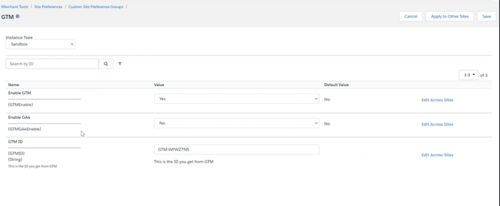 For that, let’s go to Merchant Tools > Site Preferences > Custom Preferences > GTM.