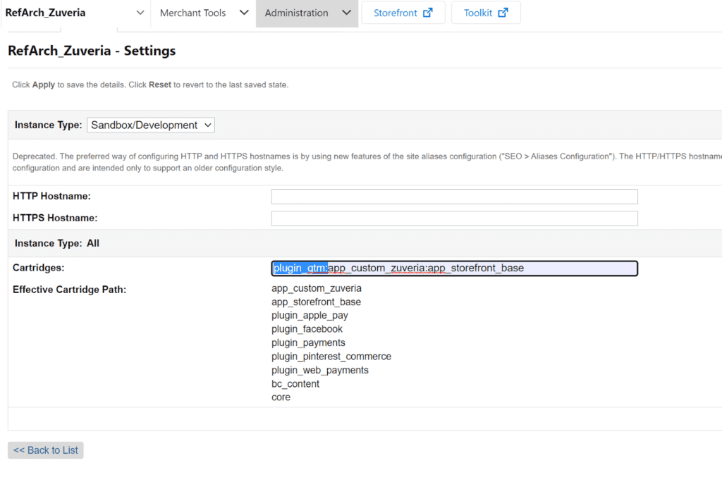 and configure it in your sandbox’s cartridge path under Administration> sites > manage sites > select site > settings. Make sure you configure this cartridge before your base cartridge.