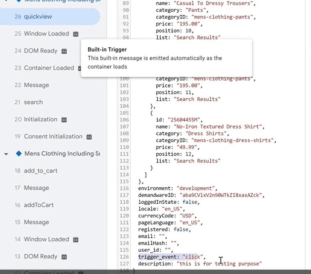 Here, As you can see, we wanted to send Quickview’s data to the GTM. For that, we have written a JSON under the quickview click event.