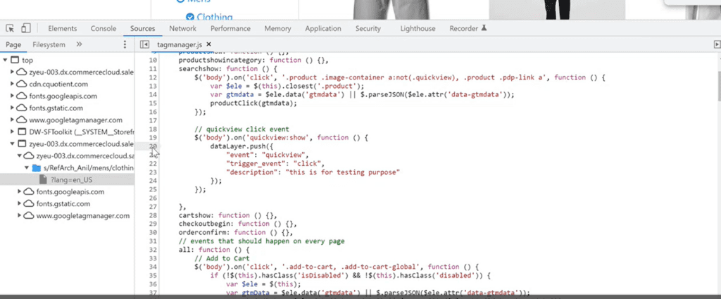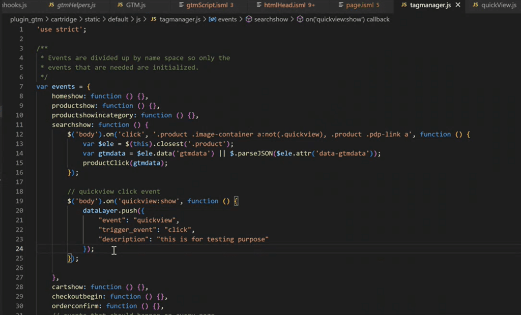 - Quickview: show—on line number 19—where we have used this Quickview:show trigger in the tagmanager.js file to push data to the dataLayer object on click of that Quickview button.