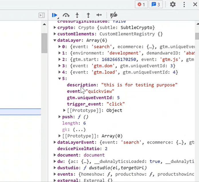 After the step-over, you can see that one more index is added to the data layer, which contains our Quickview event data. Now the same data will be passed to the GTM as well.