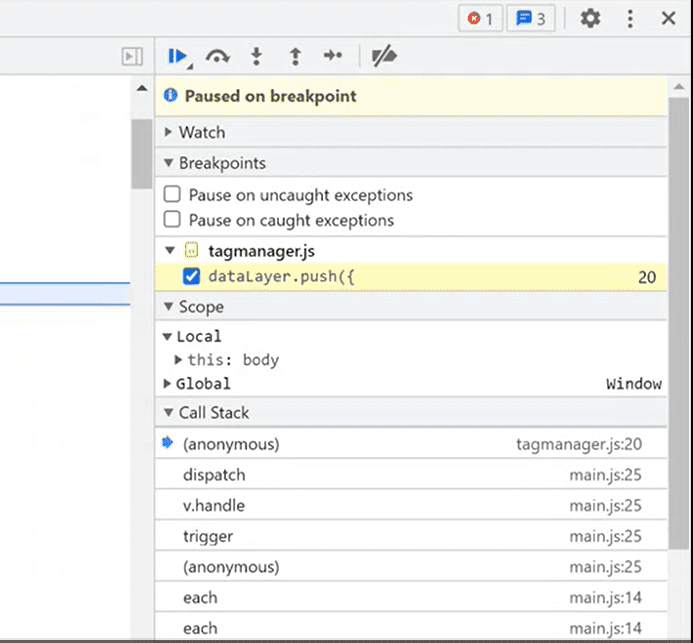 Once the debugging is started, expand the global object and go to the data layer.