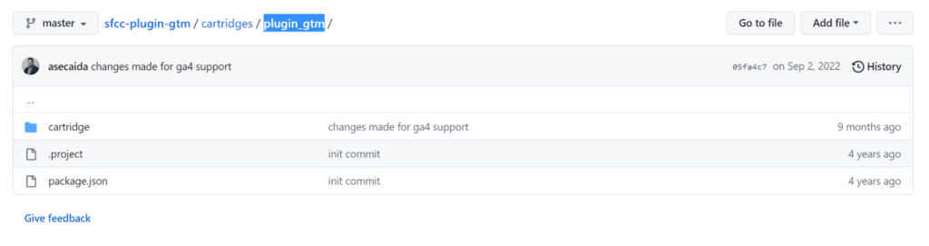 https://github.com/redvanworkshop/sfcc-plugin-gtm After that, Go to cartridges/plugin_gtm , then copy the plugin_gtm folder name