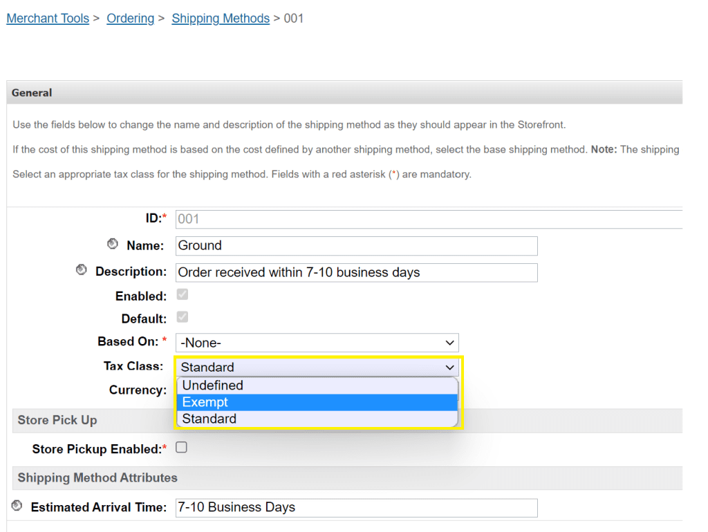 8. To assign tax classes to shipping methods, navigate to Merchant Tools > Ordering > Shipping Methods and select the shipping method you want to configure. You will be landed on a Shipping Method Configuration page, as shown below. Select the applicable tax class from the Tax Class drop-down.