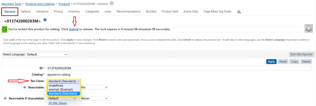 6. To assign tax classes to products, navigate to Merchant Tools > Products and Catalogues > Products, select a product, and you will be landed on a product configuration page as shown below. Click on lock, as products are by default locked for modification of data.