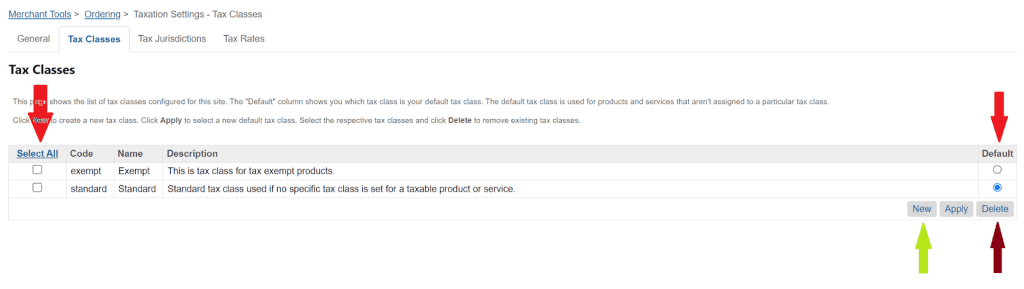 A tax class is a collection of tax rates for different tax jurisdictions. Under the Tax Class Tab, we can create or delete tax classes for a site. We can make a tax class default for a site. The default tax class is used for products and services that aren’t assigned to a particular tax class. We can create a new tax class and delete the existing tax classes.