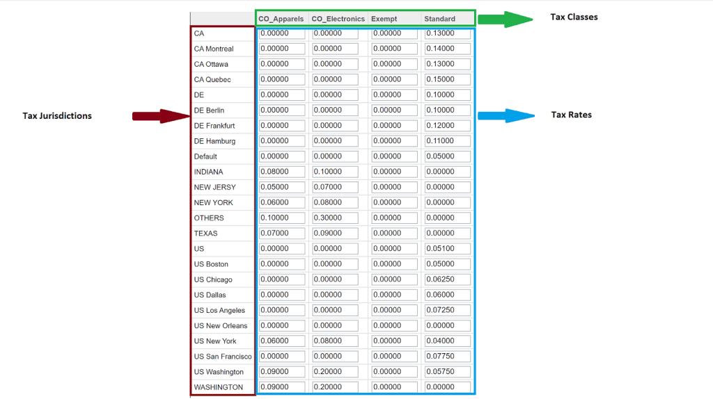 Under the Tax Rates tab, we can configure the tax rates for each tax jurisdiction. Please see the below image for reference.