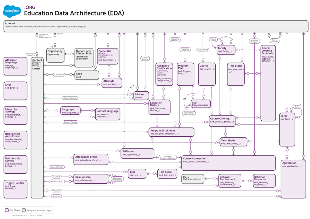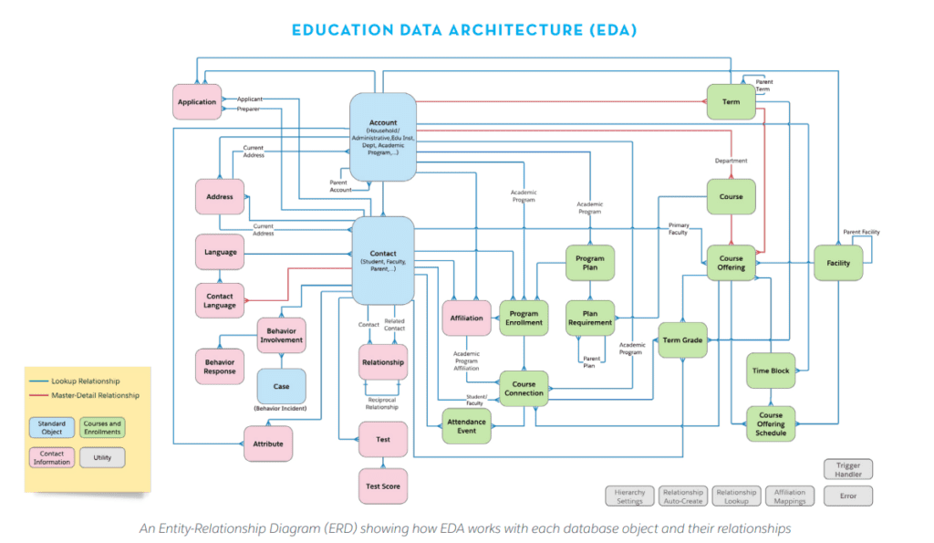 Education Data Architecture (EDA) is a community-driven data architecture specifically designed to assist educational institutions in utilizing Salesforce. By implementing EDA, educational institutions can benefit from a scalable framework that suits their unique requirements right from the start.